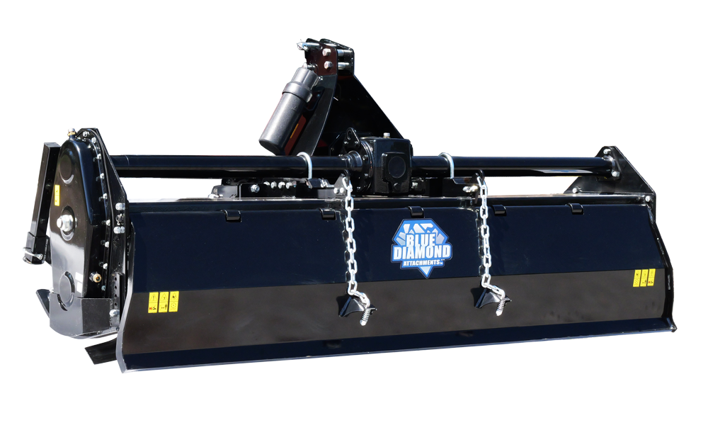 The Blue Diamond® Rototiller Series delivers exceptional soil preparation performance for compact and utility tractors from 20–65 horsepower. Built with a heavy-duty, gear-driven transmission and heat-treated steel tines, these 3-point tillers dig deep—up to 8 inches—to break hard-packed ground, mix organic matter, and level the soil in one pass. Available in 48” to 85” widths, Blue Diamond® Rototillers offer reliable power and precision for gardens, food plots, vineyards, orchards, and field applications. Designed for long-term durability and backed by a 2-year warranty, they’re the perfect combination of strength, efficiency, and dependability.