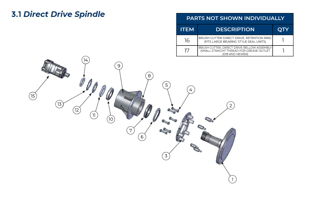 203076 - BRUSH CUTTER DIRECT DRIVE HOUSING ONLY, WIDE TOP C-FLANGE Units manufactured 2014 and older will need to replace the whole direct drive if the straight spindle housing needs to be replaced. 203073. If making this change, a motor and motor flange seal will also be needed |